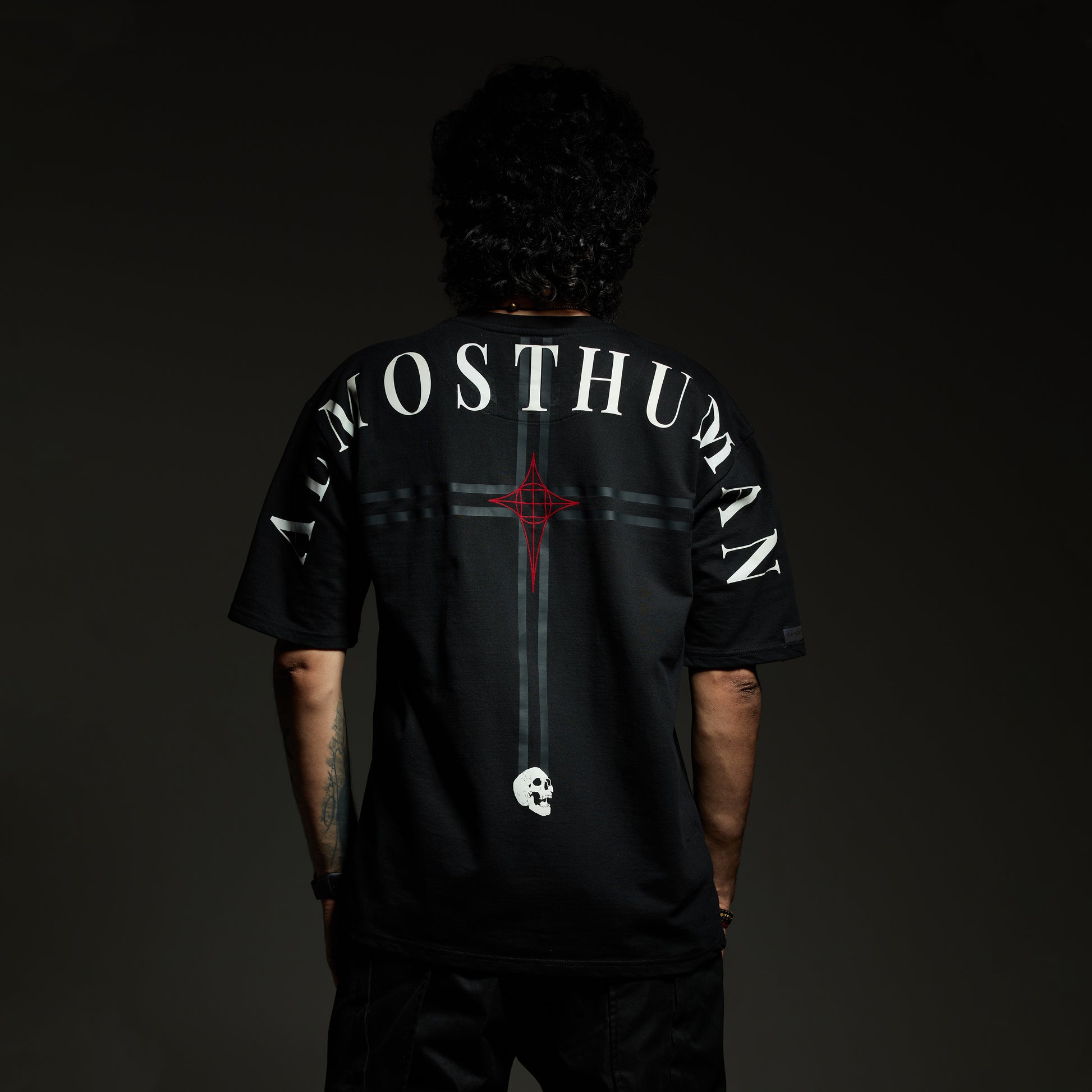 On the Back, 'Almost Human' text stretches boldly from the left sleeve to the right, all printed in our White Rainbow Reflective tech. Underneath it, Two black lines intersect, creating a striking Cross sign ✝ , with a vibrant Red Cross marking the heart of the design.