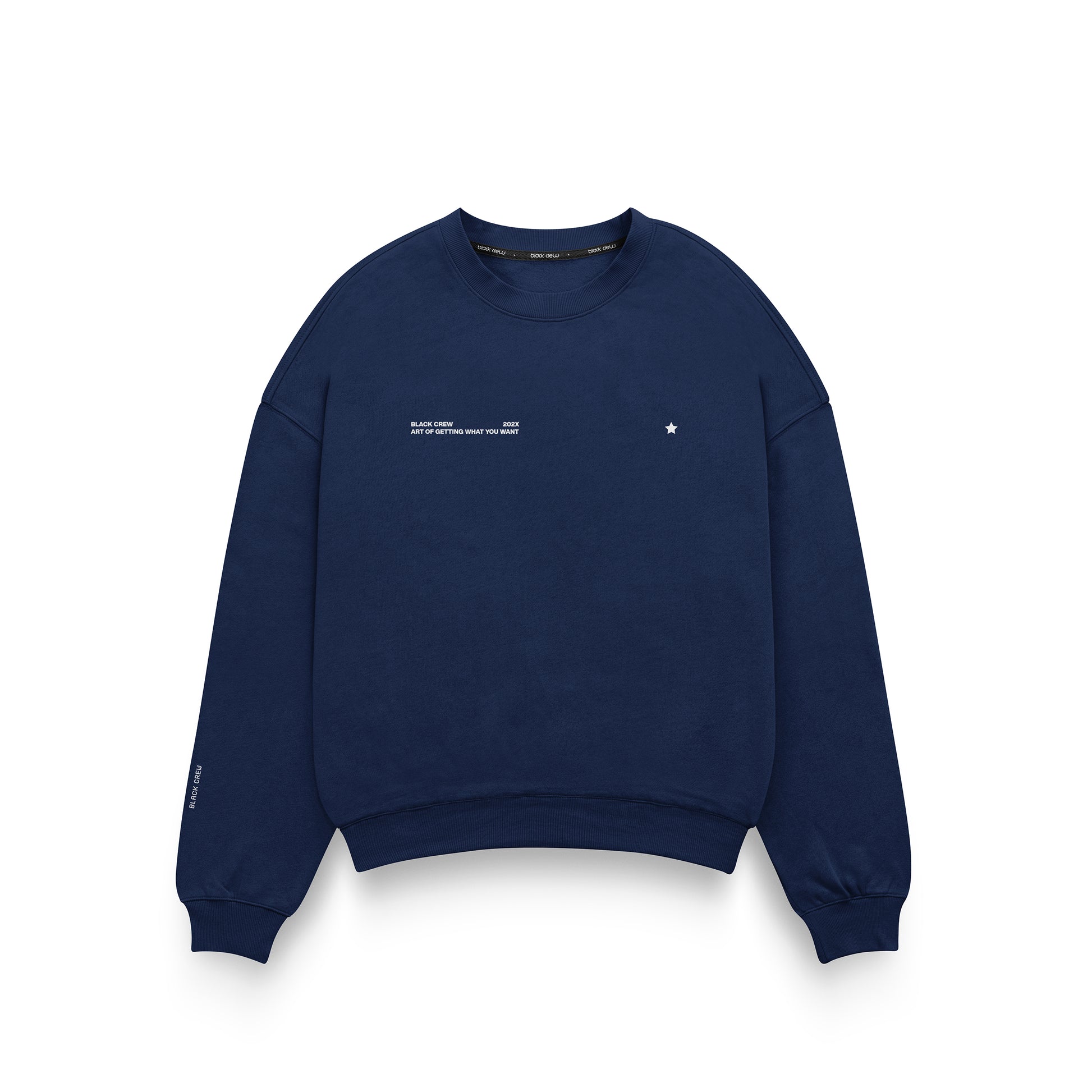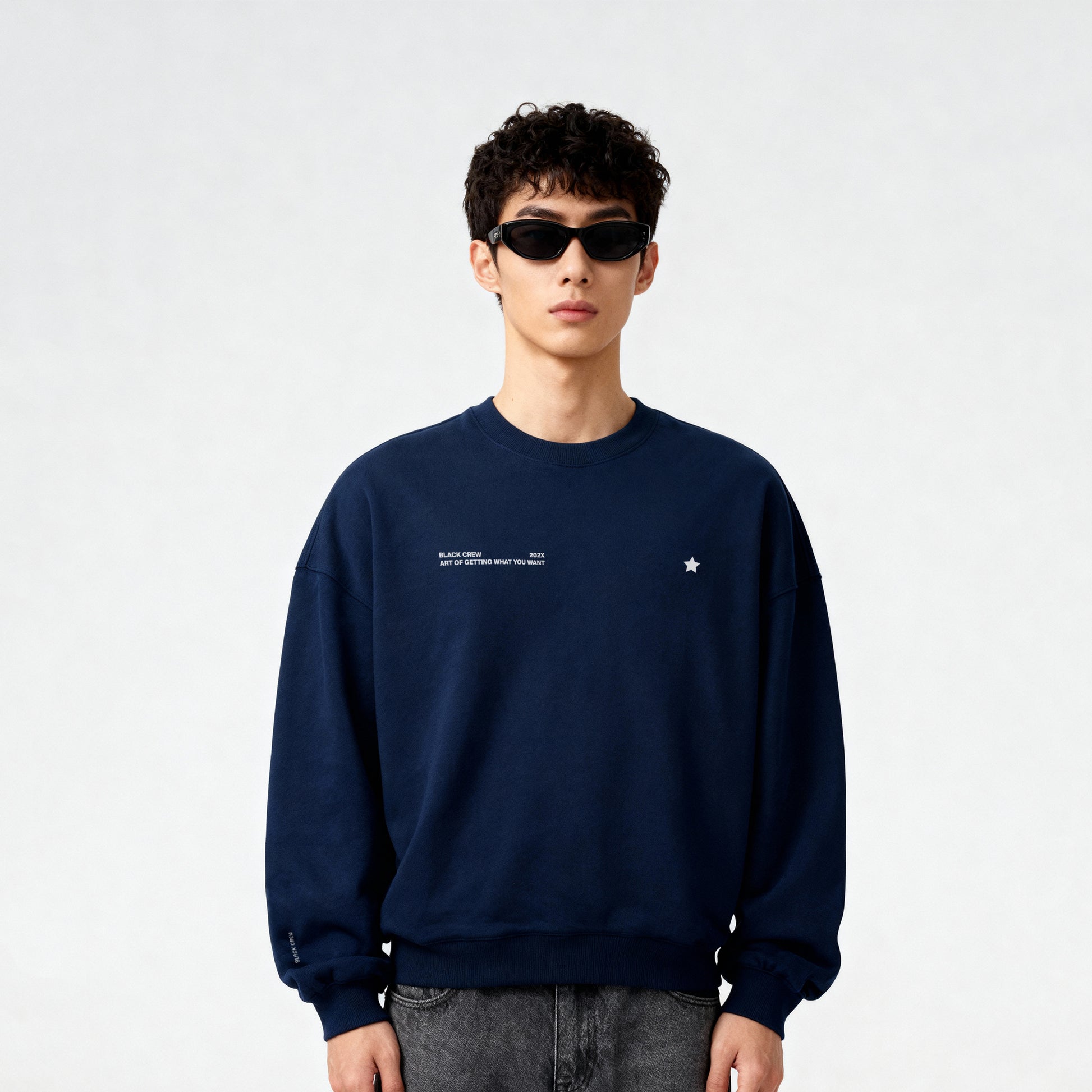 Our Signature Sweatshirt fit in our Deep Navy colour, featuring a statement Reflective print across the back for a bold contemporary streetwear aesthetic.