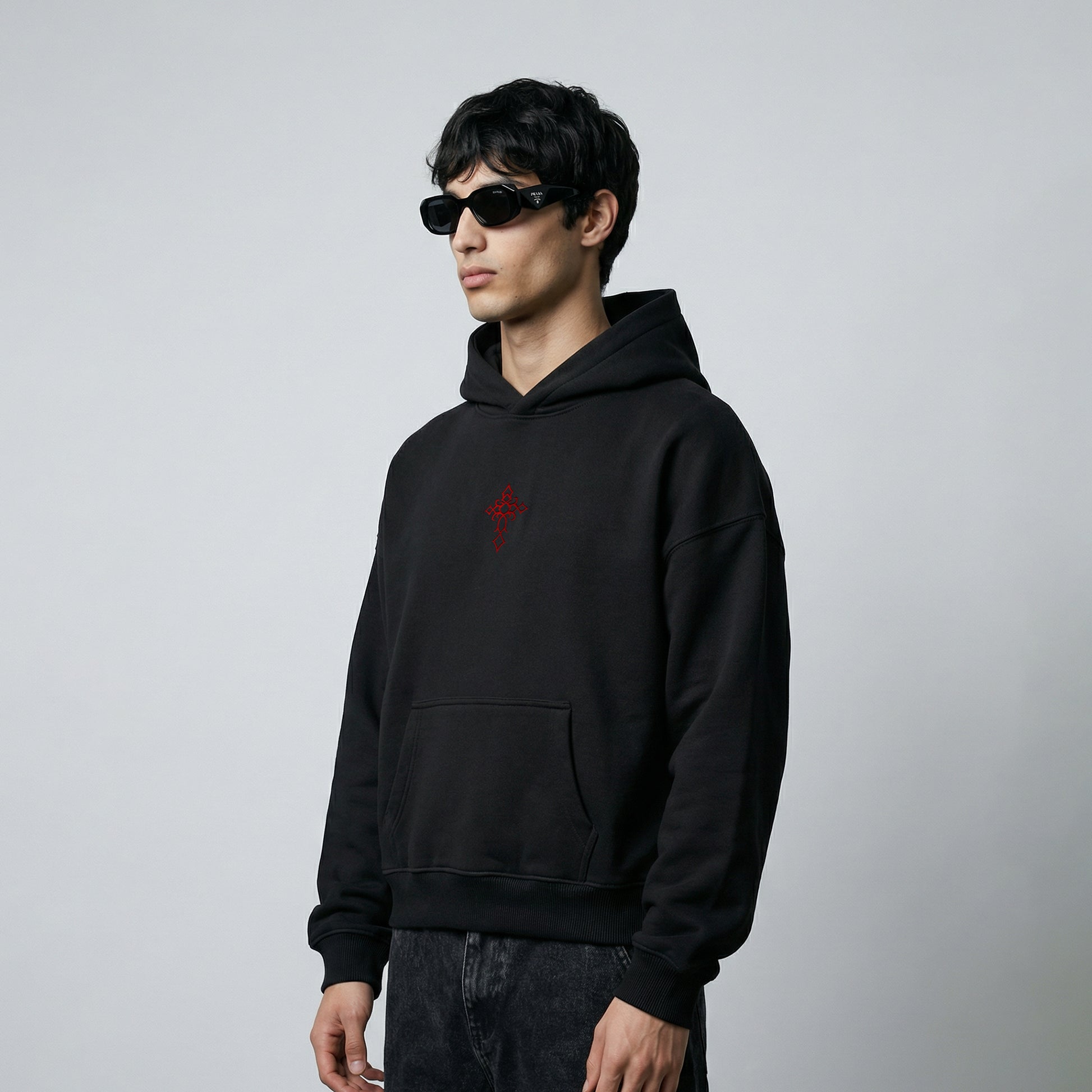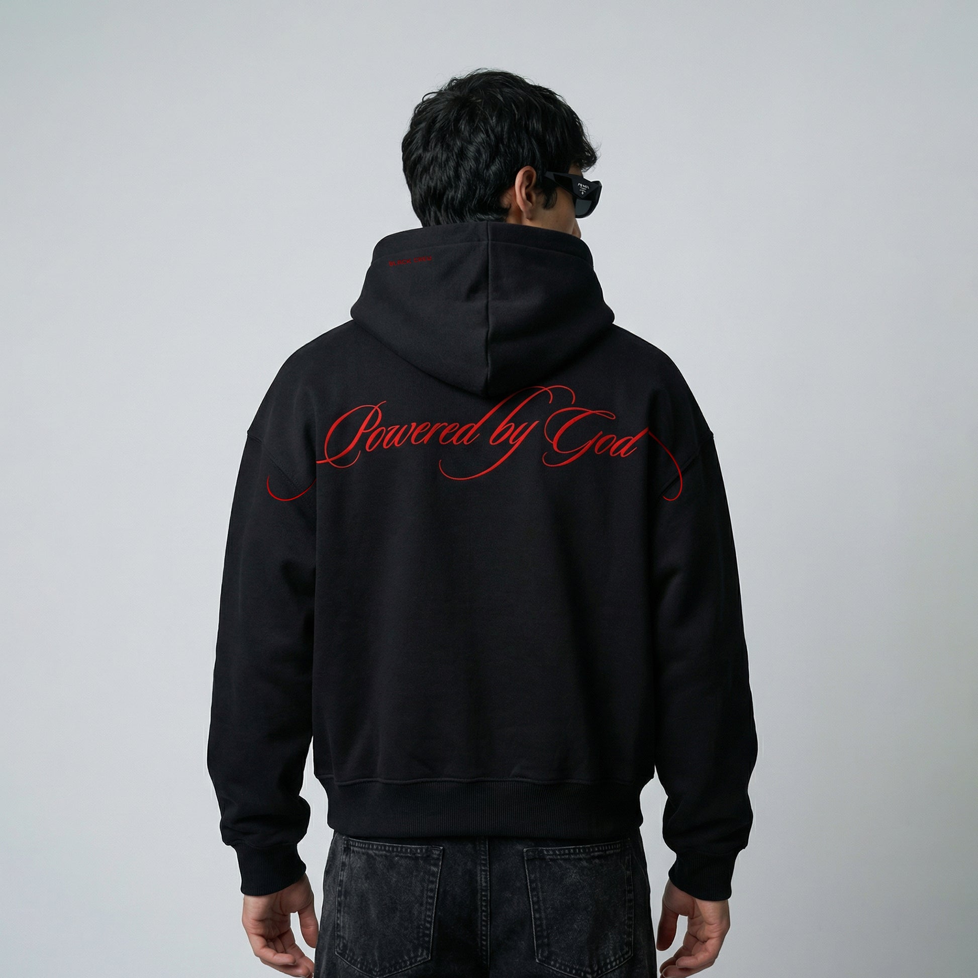 Black hoodie featuring a “Powered by God” calligraphic script printed across the back in Red flock velvet finish print, designed to feel timeless, balancing softness with strength.