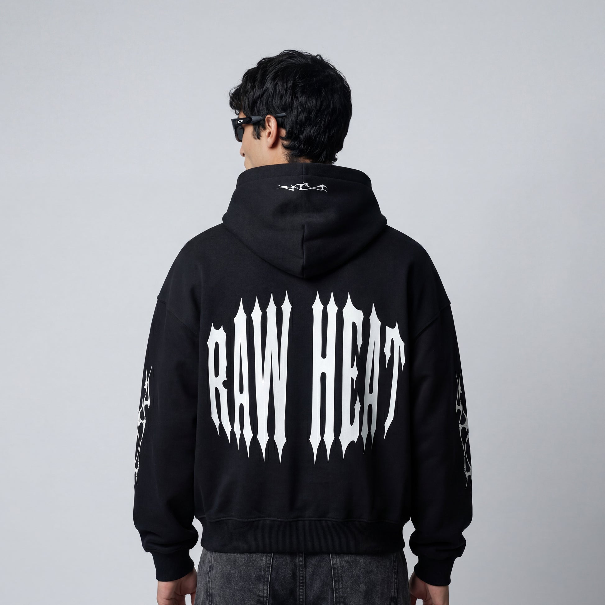 The back features RAW HEAT in oversized, spiked typography, stretched wide across the back to create a hype visual presence.