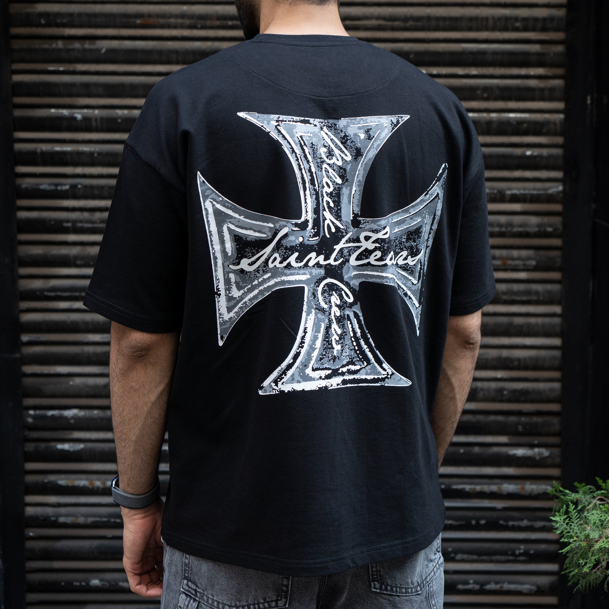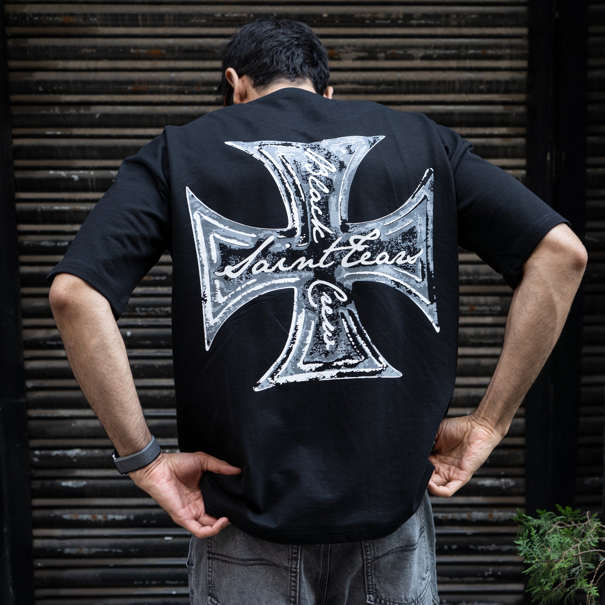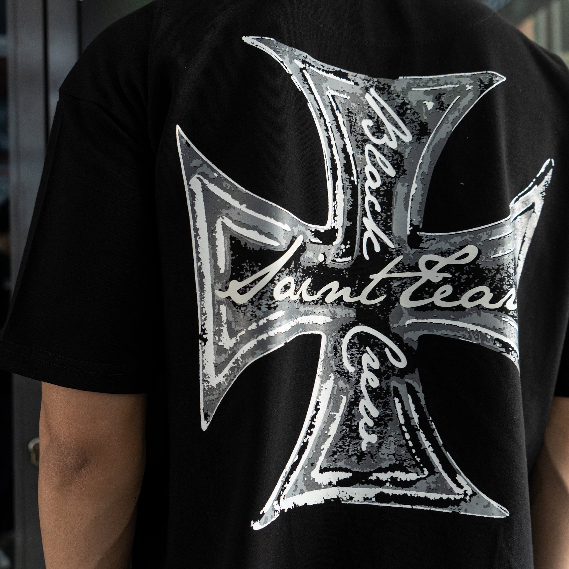 On the Back, a distressed Iron Cross anchors the tee, overlaid with intersecting script in White Rainbow Reflective over screen-printed layers.