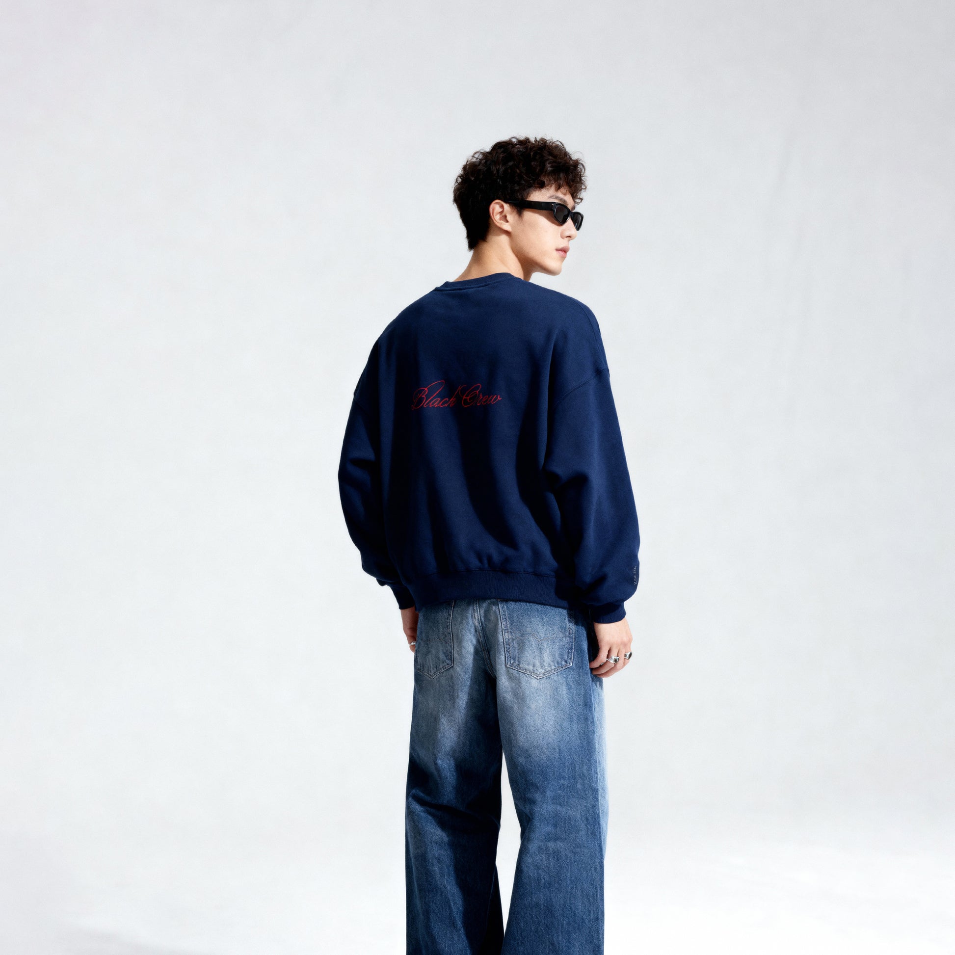 Our Premium Basic Sweatshirt in Deep Navy colour, featuring a cursive Black Crew script graphic at the back for an elevated streetwear aesthetic.