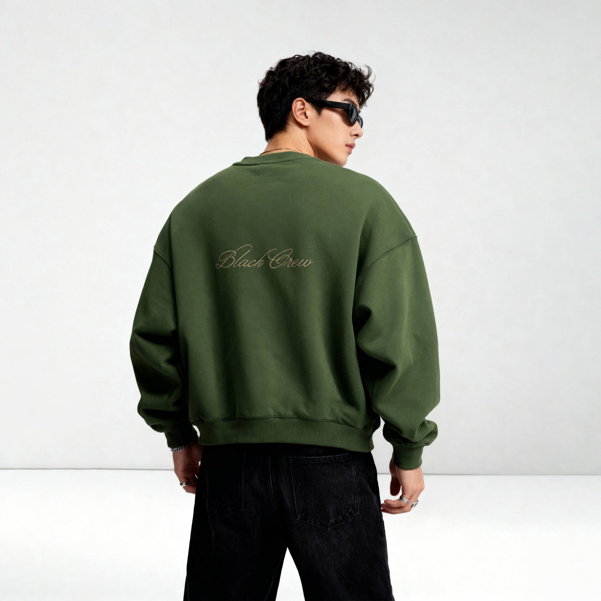Our Premium Basic Sweatshirt in Dark Olive colour, featuring a cursive Black Crew script graphic at the back for an elevated streetwear aesthetic.