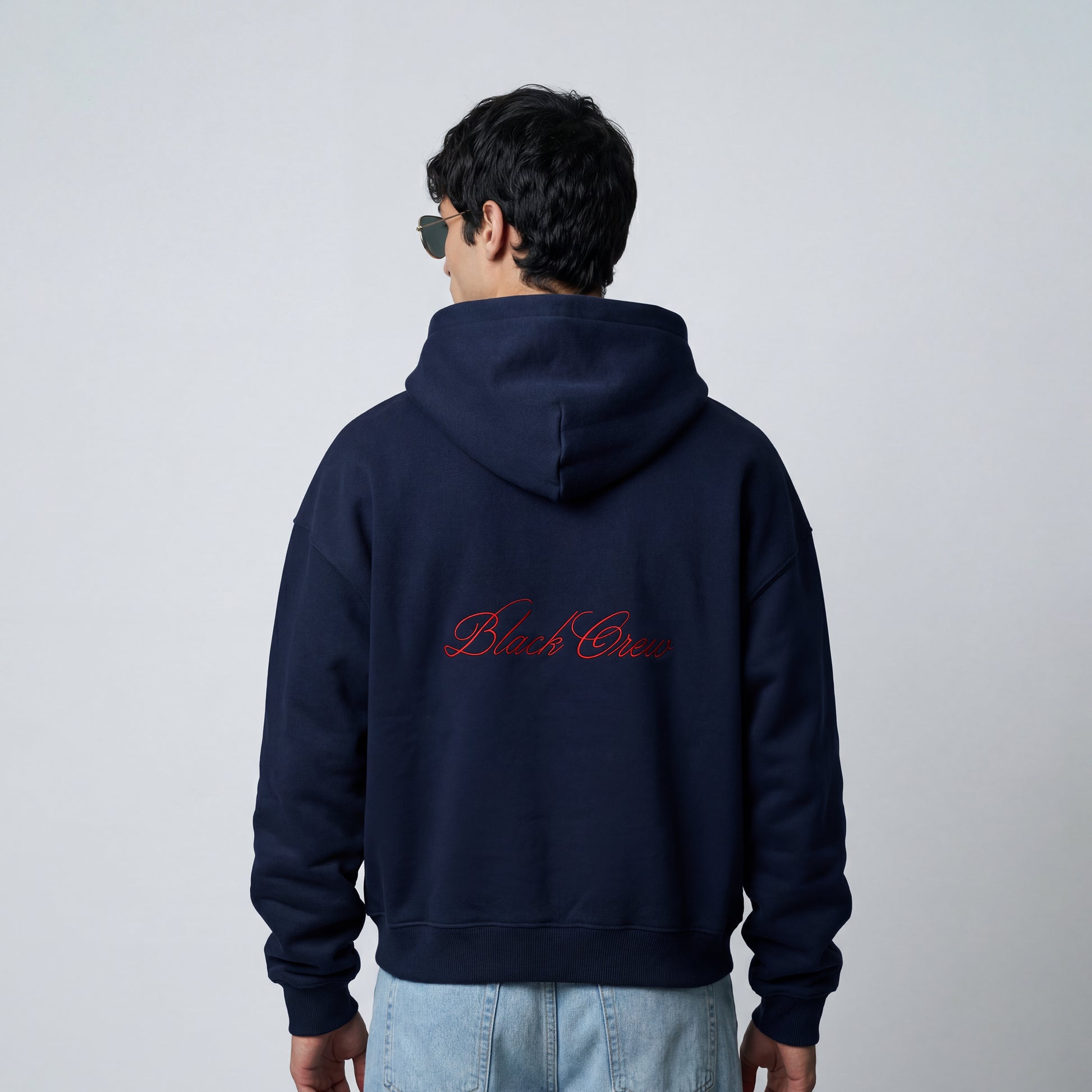 Our new launch - Zip-up Hoodie, in Deep Navy colour, featuring a cursive Black Crew script graphic at the back for an elevated streetwear aesthetic.