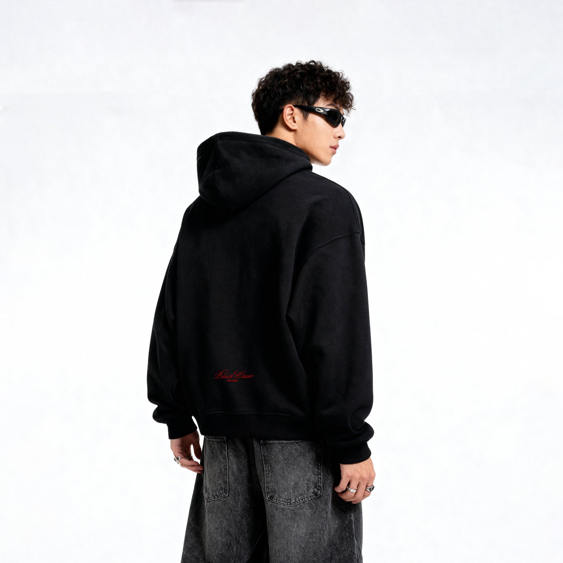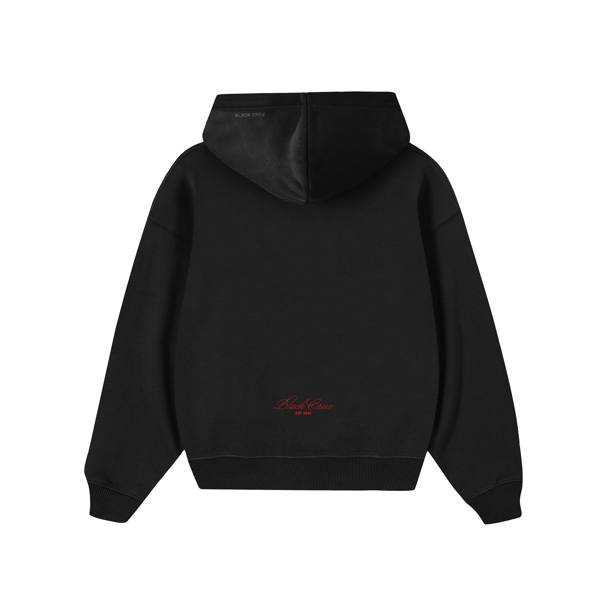Our Signature Hoodie fit in our Onyx Black colour, featuring a bold Red print across the front for a contemporary streetwear aesthetic.