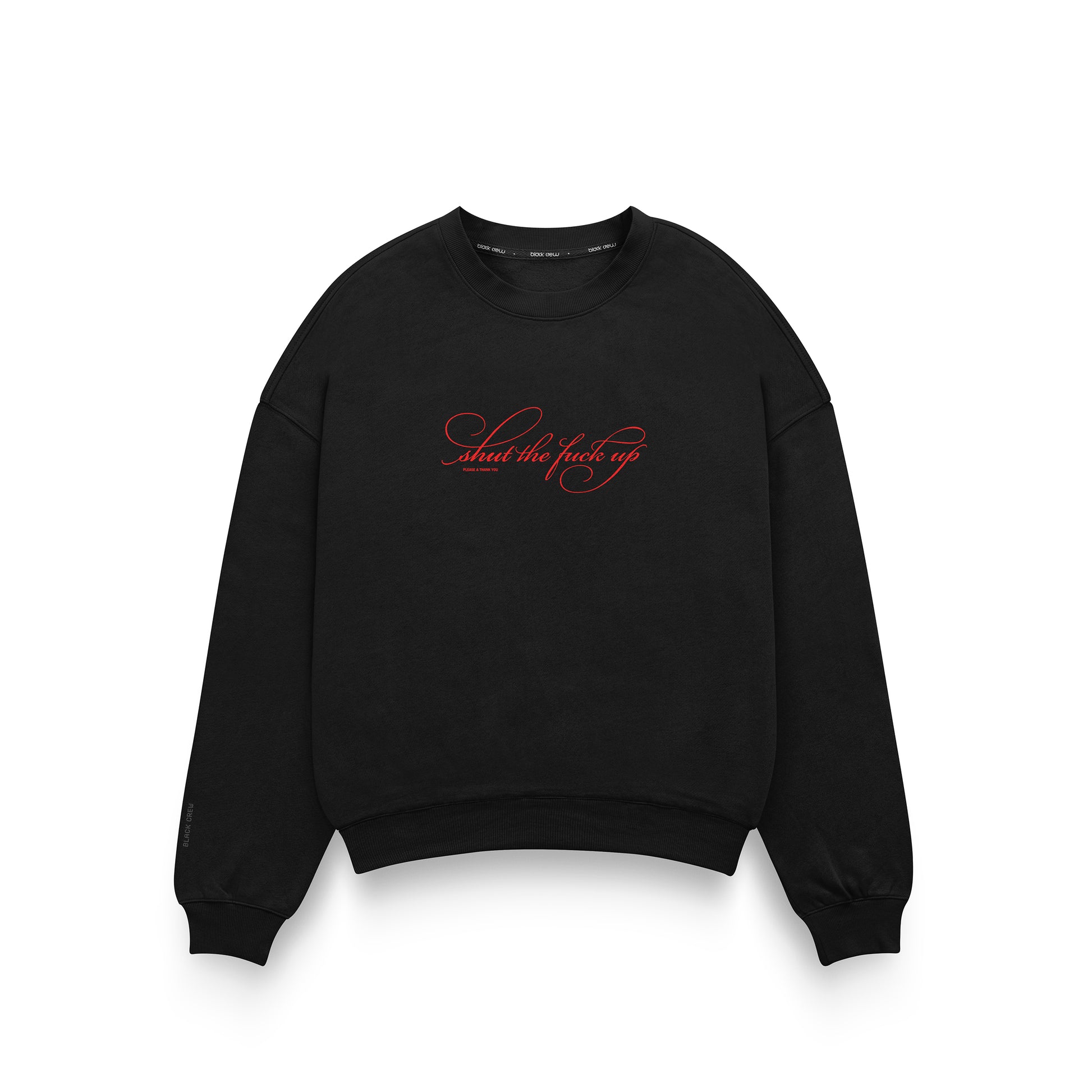 Our Signature Sweatshirt fit in our Onyx Black colour, featuring a bold Red print across the front for a contemporary streetwear aesthetic.